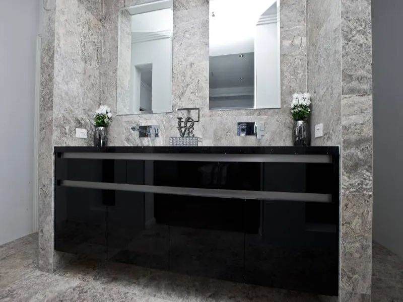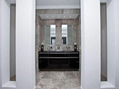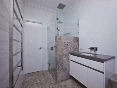 Ensuite with floor to ceiling stone tiling