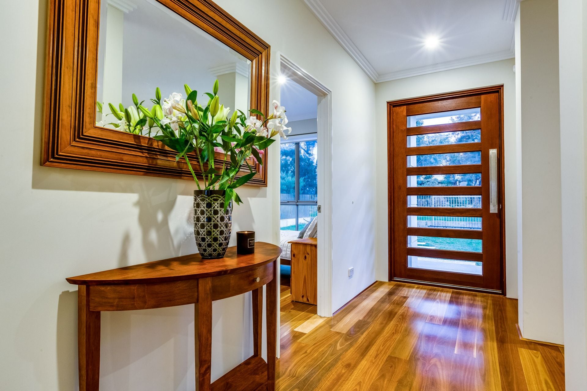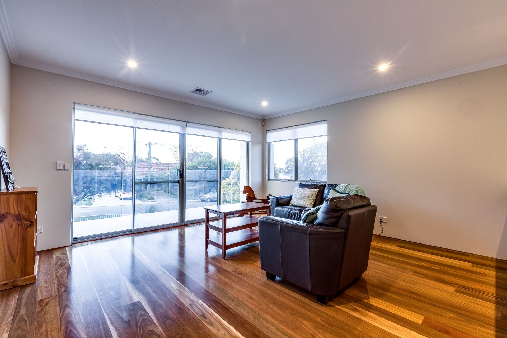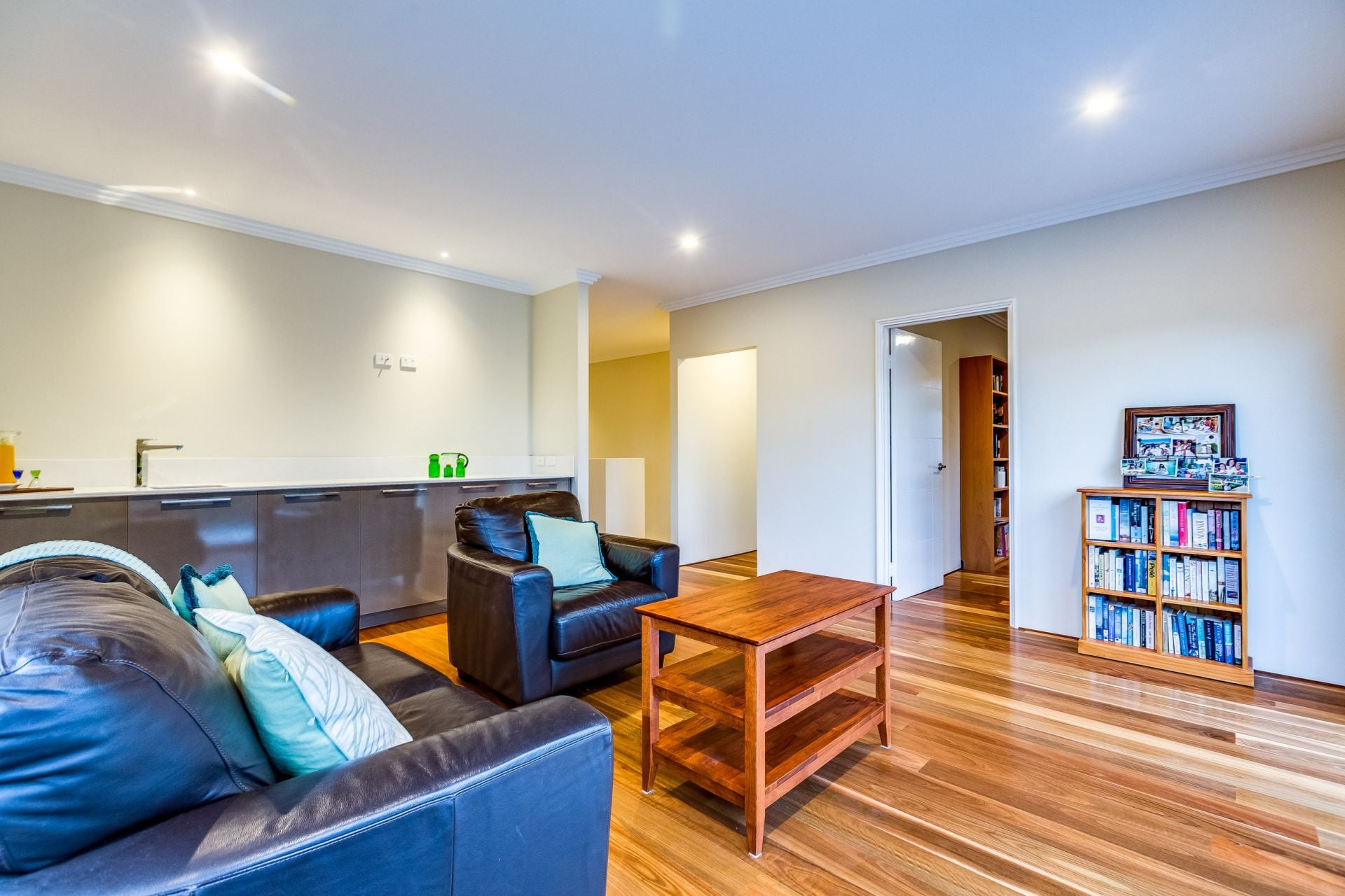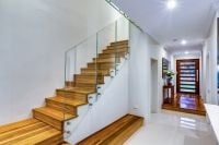 Australian hardwood Spotted Gum timber flooring and polished porcelain tiles throughout