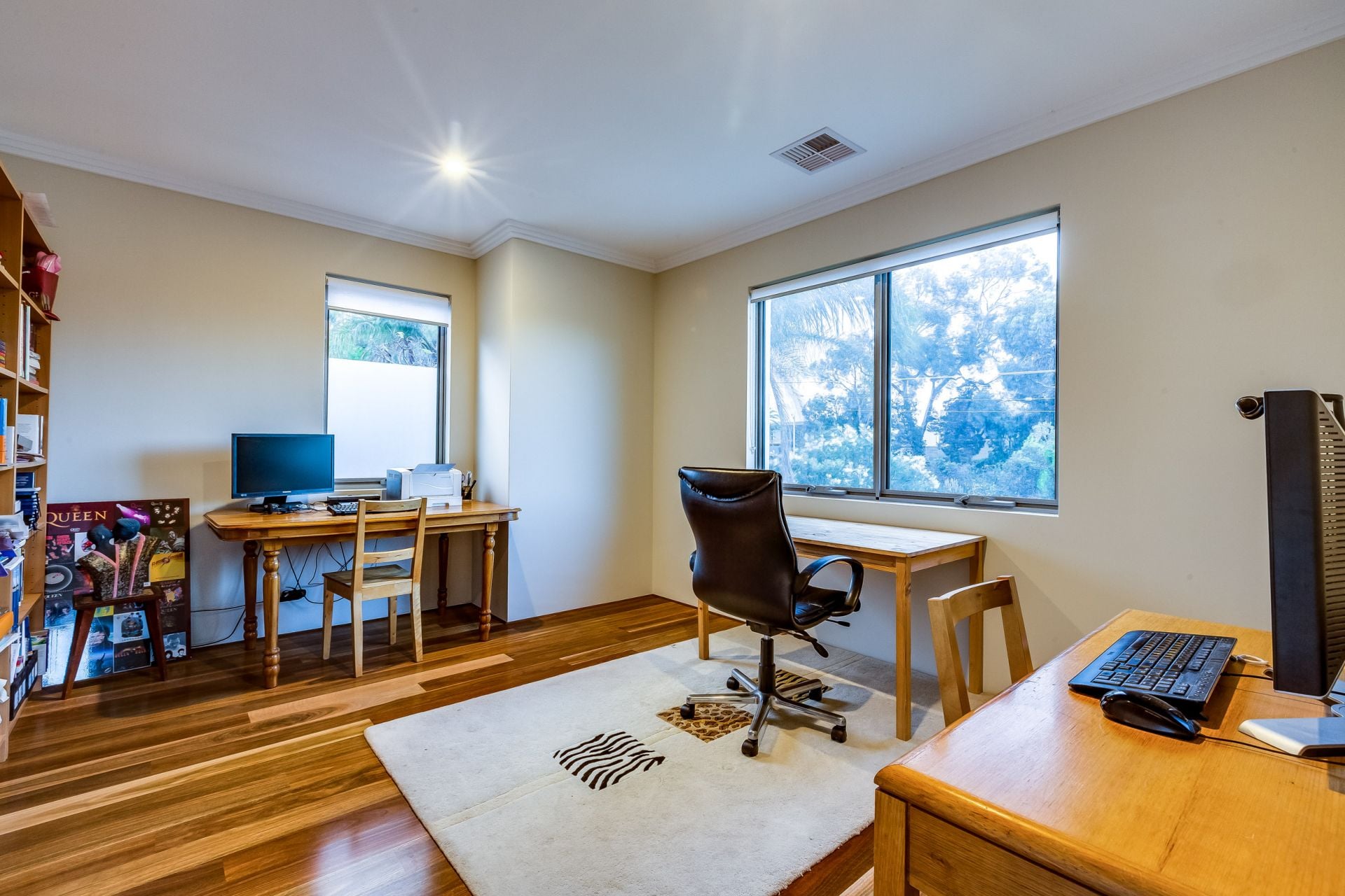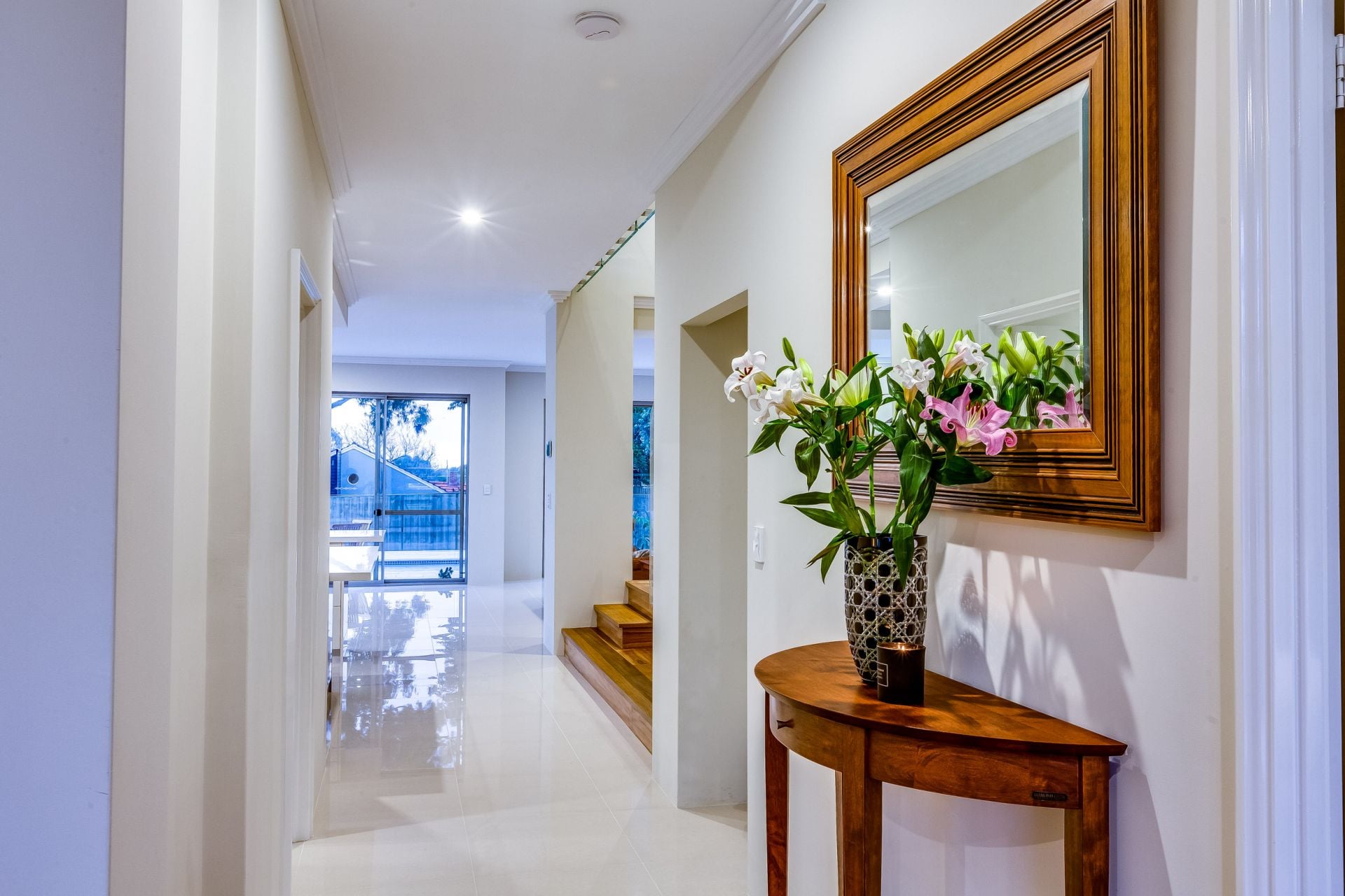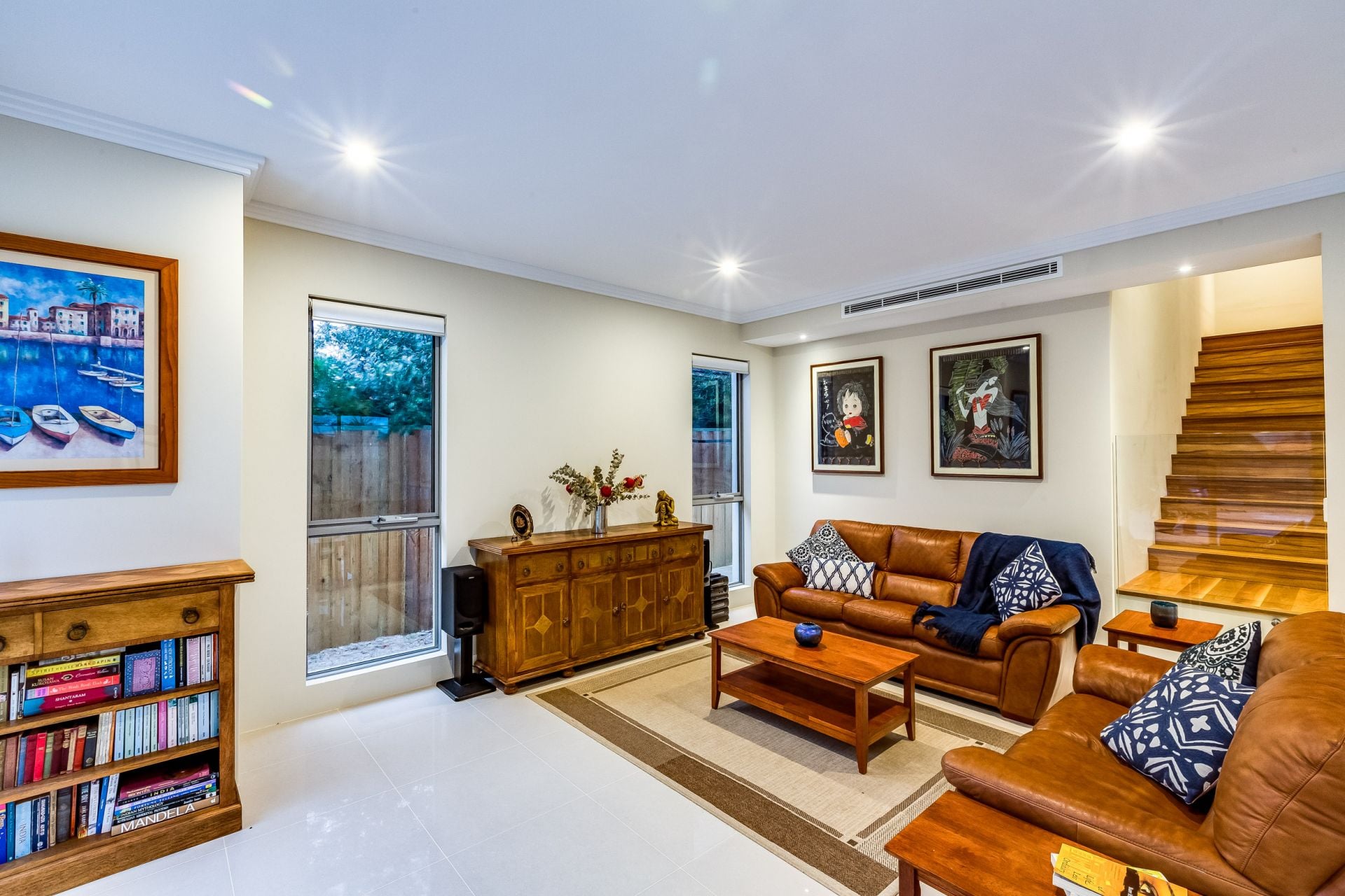 Australian hardwood Spotted Gum timber flooring and polished porcelain tiles throughout